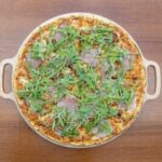 piza 24 Gamberi e rukola sos, ser, kamambert,suszone pomidory,szpinak z czosnkiem, rukola